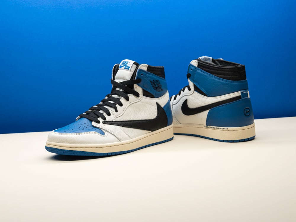 Along with Hiroshi Fujiwara’s Fragment Design clothing brand, Travis Scott helped usher in the three-way collaboration trend in late 2021 with the release of both the Air Jordan 1 High OG and Air Jordan 1 Low OG “Military Blue.” Both styles feature signature Fragment and Travis Scott design elements, including industrial-style branding, Fragment’s lightning bolt logo, and Scott’s reverse Swoosh.